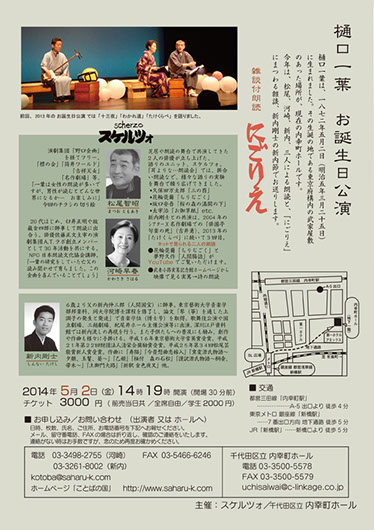 去年から、内幸町ホールが企画している、「生誕の地でお送りする樋口一葉お誕生日公演」の第2回目。
