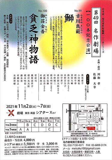 短い作品を日本つずけて上演します。私が出演するのは最初の「鰤」の方で主役をやらせていただくことになりました。 名作劇場は10本目の出演になりますが、10年ぶりです。過去の作品は「これまでの公演」からご覧いただけます。